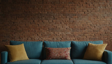 Comfortable sofa with pillows on brick wall background, interior design