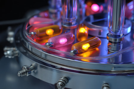 A high-tech medical device produces vibrant, glowing capsules, showcasing the future of healthcare and innovative technology in a sterile environment.