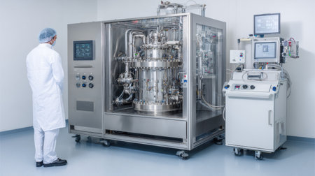 Scientist in lab coat and hairnet monitors a sophisticated bioreactor in a sterile laboratory setting, showing modern technology and research practices.