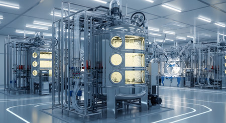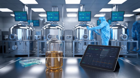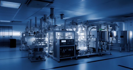 This modern laboratory showcases industrial bioreactors designed for biopharmaceutical and biotechnology research, emphasizing sterile processing and advanced technology.