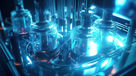 Exploring futuristic technology in a laboratory with glowing bioreactor at night. Generative AI