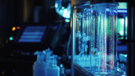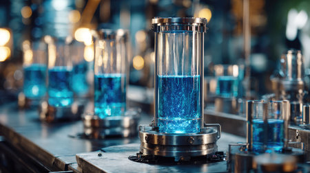 Several cylindrical glass containers hold vibrant blue liquid. The setup includes metallic supports and reflective surfaces. The image features a shallow depth of field, with soft lighting enhancing the visual texture and structure of the elements. It could be used for illustrating advancements in biotechnology or scientific innovation.