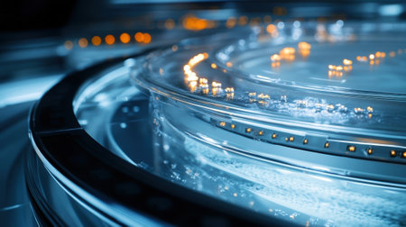 A captivating close-up view of advanced industrial equipment showcasing illuminated glass components. This high-tech machinery epitomizes innovation and precision in a contemporary workshop setting.