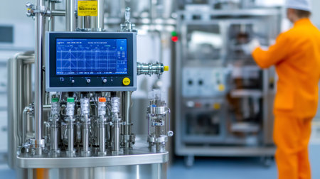Complex industrial equipment displaying data on a digital screen while a technician works in the background of a modern, clean pharmaceutical manufacturing plant