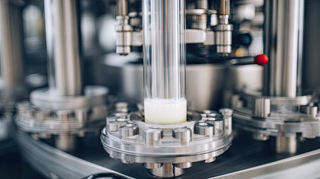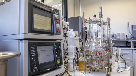 A crisp image of a laboratoryscale bioreactor with bubbling culture broth visible through its transparent sides highlighting sensors and digital displays for monitoring growth.