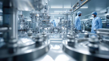 Professional technicians in protective gear operate sophisticated machinery in a clean pharmaceutical environment, showcasing industrial precision and hygiene standards.