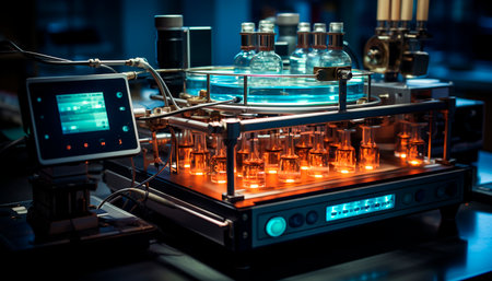 Laboratory equipment displays glowing liquids in a sleek, modern environment filled with technology.