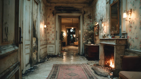 Abandoned hallway with scorched wallpaper, burnt fireplace, and decaying furniture creating a haunting, eerie atmosphere.