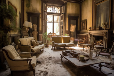Broken vintage mirror lying on rubble in a dilapidated, abandoned building with antique furniture.