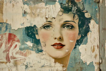 An old, torn, and faded collage of vintage advertising posters on an aged wall, featuring the face of a beautiful woman in a delicate style. --ar 3:2 --v 6.1 Job ID: 78c0e15d-24b0-4044-8fb8-b02096a375e6