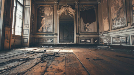 Abandoned grand room with peeling paint and broken wooden floor. Concept of decay, neglect, historical architecture, urban exploration, haunted house, scary room, Halloween.