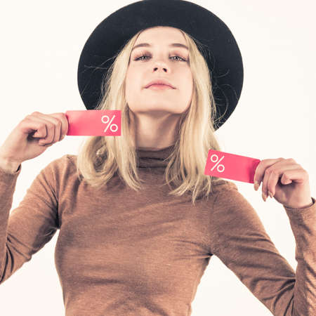 Woman in hat showing tag with shopping sale percentage sign enjoying cheap clothing. Female wearing stylish outfit.