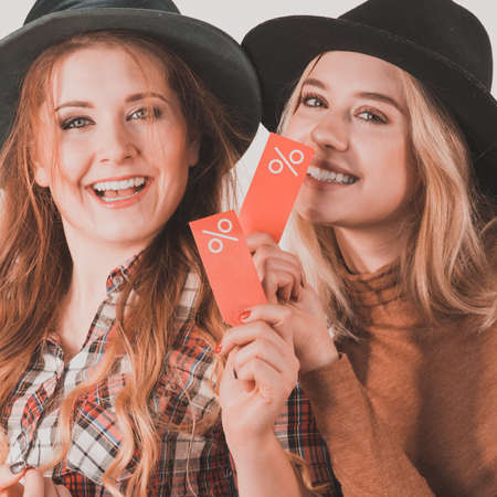 Female friends on shopping showing tag with sale percentage sign enjoying cheap clothing.