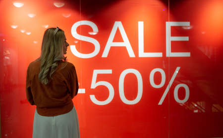 Kiev, Ukraine. January 2, 2021. Showcase of women's clothing store. A symbol of discount up to 50 percent. Large seasonal sales in retail stores. Trade center, modern mall, shopping center from inside