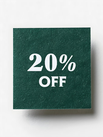 White '20% OFF' Text on a Dark Green Square Paper Note. White background with copy space