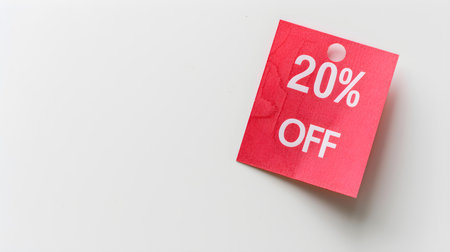 White '20% OFF' Text on a Red Square Paper Note. White background with copy space