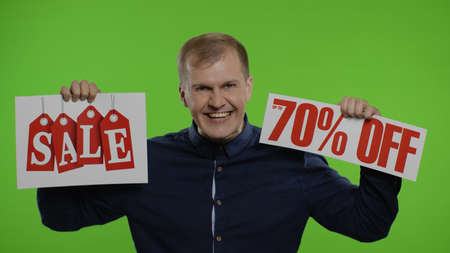 Great discounts. Happy cheerful blonde man showing Sale word and showing Up To 70 percent Off purchase inscription. Shopping with low prices, Black Friday concept. Chroma key background. 6k downscale
