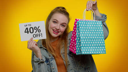 Cheerful teenager girl showing shopping bags and Up To 40 Percent Off inscriptions banner text. Black Friday. Good holiday discounts, low prices for shopping. Young woman posing on yellow background
