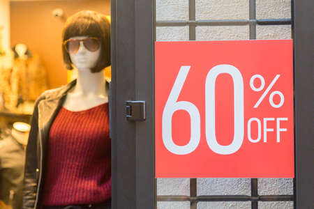 Female mannequin near sign with discount inscription SALE 60 in a clothing store.
