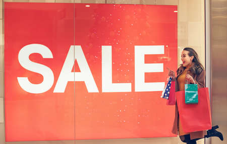 Woman holding shopping bags in front of store window with copy space. Focus on the store window. Sale