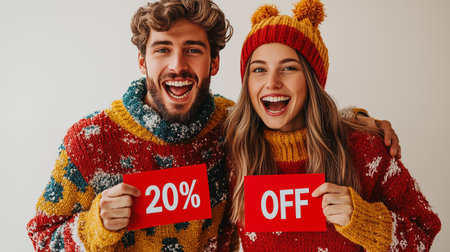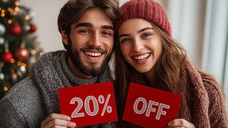 Beautiful young couple in warm sweaters holding sign with 20 percent off at home