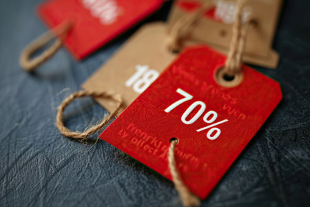 close up red discount tag with 70 off written on them.