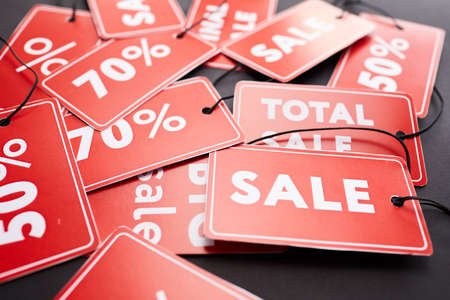 Close-up of red Sale tags stacking on table, modern labels for shops and stores