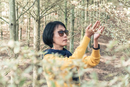 closeup portrait of modern Asian mature woman at the forest