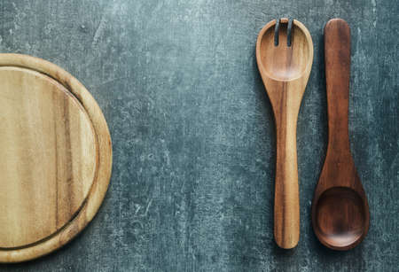 Wooden spoons and cutting board, kitchen utensils, vintage style. Top view