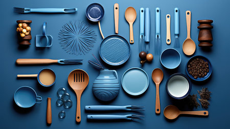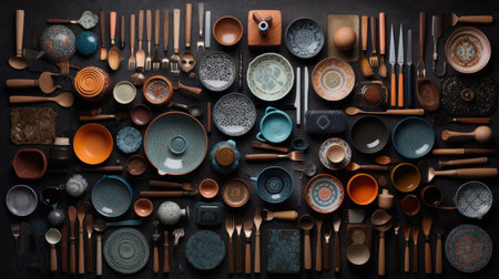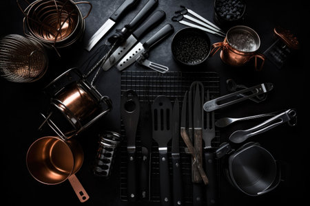 edgy flatlay of metal cooking tools against black background, created with generative ai