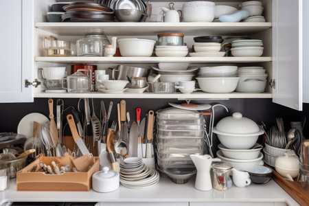 organizing and storage solutions in the kitchen, with shelving, drawers, and pots & pans, created with generative ai