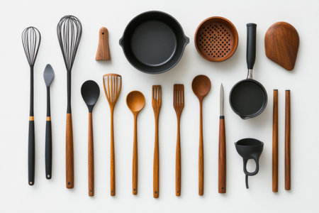 Flat lay displays a variety of kitchen utensils including spatulas, whiskeys, and small pots, arranged neatly on a white surface for easy viewing.