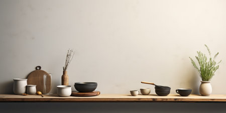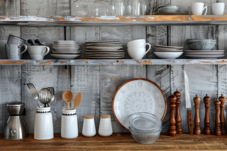 A cozy kitchen scene featuring a wooden shelf filled with various cookware and utensils. Perfect for illustrating modern culinary lifestyle and home decor.