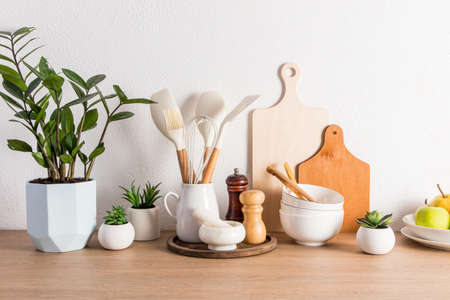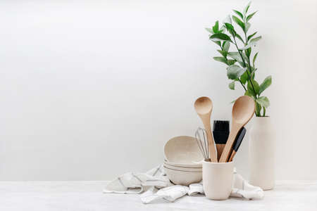 Closeup of eco-friendly kitchenware, utensils, towel and plant on table in kitchen with white walls. home comfort. Household equipment. earth-friendly products