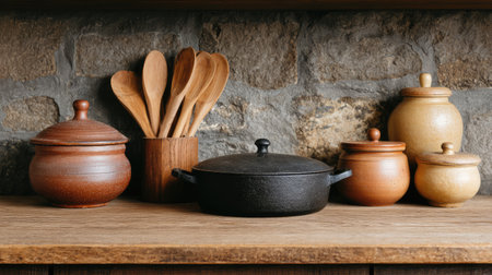 A charming kitchen scene showcasing a variety of ceramic pots and wooden spoons, set against a natural stone backdrop, perfect for inviting home cooking vibes.