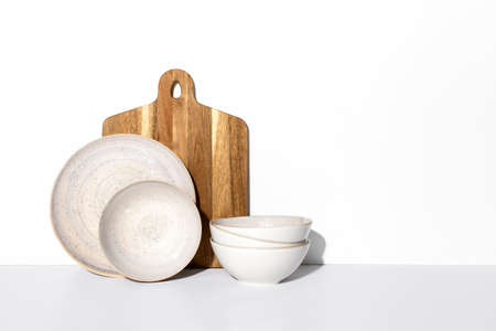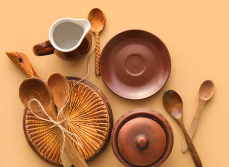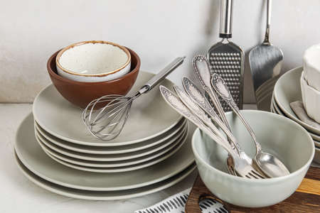 Beautiful dinnerware and kitchen utensils on counter near light wall