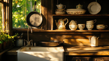 A serene rustic kitchen scene showcasing vintage crockery and cookware, beautifully illuminated by natural sunlight. A perfect blend of warmth and charm.