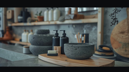 Modern bathroom decor featuring stone accessories, including soap dispensers and bowls, arranged on a wooden surface. Perfect for themes of interior design, spa, and relaxation.