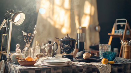 A rustic kitchen scene with vintage utensils and ceramic dishes illuminated by warm natural light.