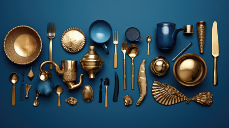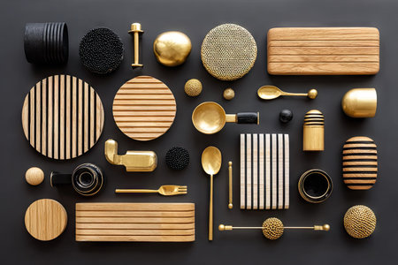 An overhead shot presents an arrangement of various gold and black objects against a dark backdrop. The composition features diverse shapes and textures, including circular elements, wooden blocks, and linear patterns. This image may be suitable for advertising, design projects, and editorial content.