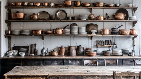 A beautifully arranged vintage kitchen showcasing copper pots and rustic wooden shelves. This warm and inviting space reflects timeless charm and craftsmanship.