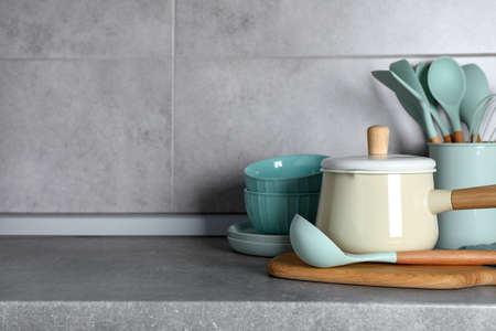 Set of different cooking utensils on gray countertop in kitchen. Space for text