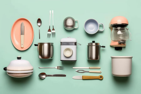 Generative AI Isometric Kithen Utensils Cutlery Collection with Knifes, Pots and Glasses. Vector flat 3d illustration