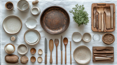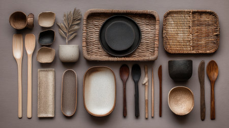 This image showcases an elegant arrangement of natural textured tableware and wooden utensils, emphasizing minimalist design and rustic charm. Perfect for home decor inspiration.