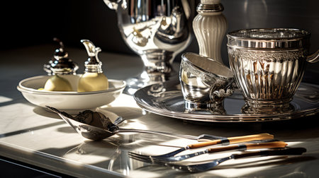 utensils gray silver background illustration tray reflective, surfaces shadow, arrangement neat utensils gray silver background
