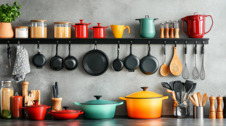 A contemporary kitchen scene with colorful pots, pans, and cooking utensils neatly organized on a wall-mounted rack, adding vibrancy to the culinary space