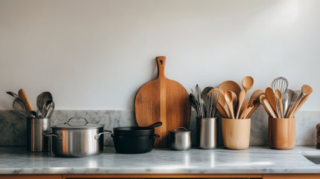 A minimalist kitchen setup with stainless steel pots, cast iron skillet, and wooden utensils neatly organized on a marble countertop, blending style with functionality