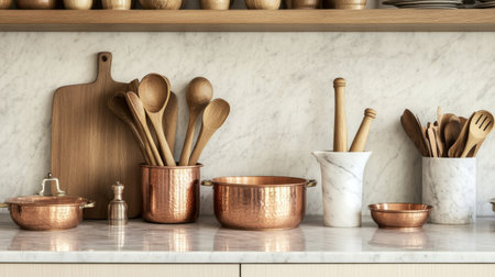 An elegant kitchen setup featuring copper pots, marble mortar and pestle, and wooden spatulas arranged on a marble countertop, exuding timeless sophistication.