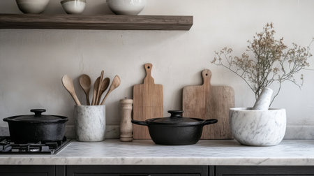 Discover a beautifully arranged kitchen setting featuring marble and wooden elements. This elegant display highlights cookware, utensils, and natural accents for a cozy vibe.