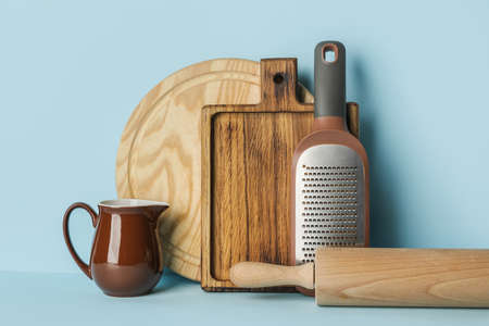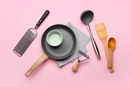 Different kitchen tools for cooking on gray concrete wall. Kitchenware with plastic material